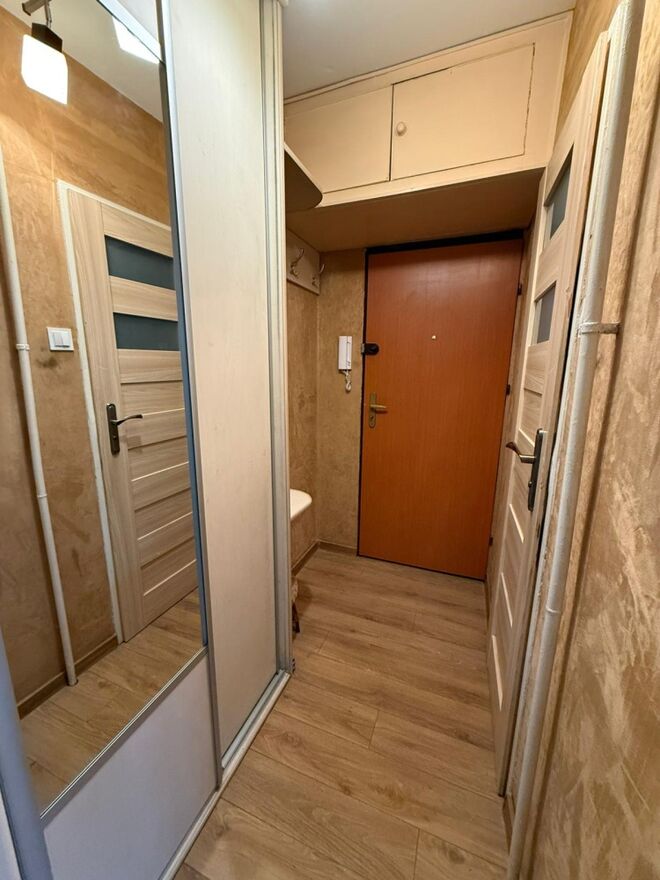 Przedpokój: szafa ok. 97 cm szerokości x 13 cm głębokości, pawlacz nad drzwiami oraz wbudowany wieszak