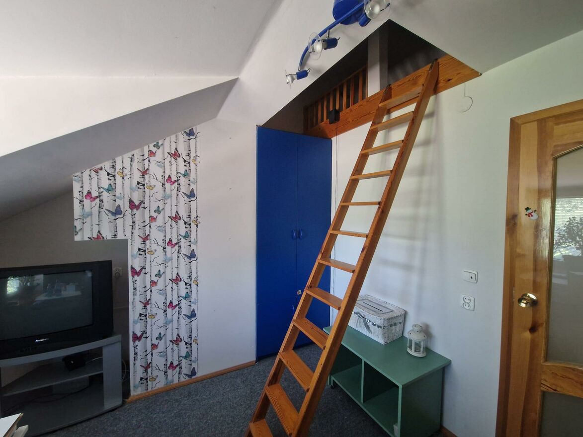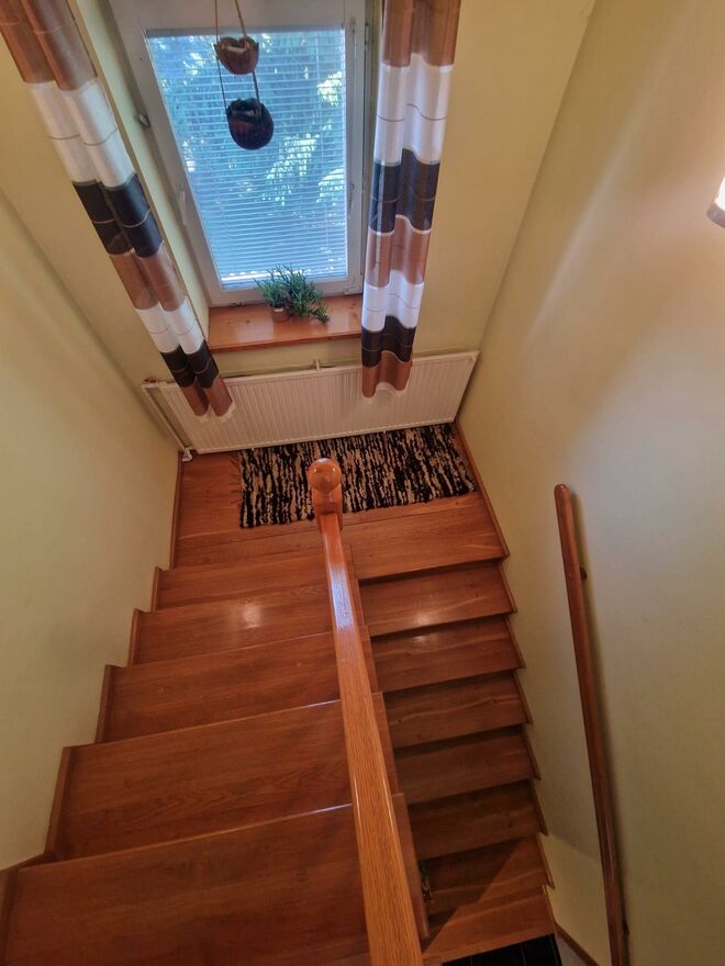 Piętro: 3 pokoje, duża garderoba, WC, taras 13,80 m, widok na jezioro. Dębowe schody i drzwi robione na indywidualne zamówienie