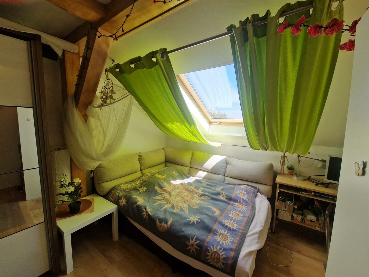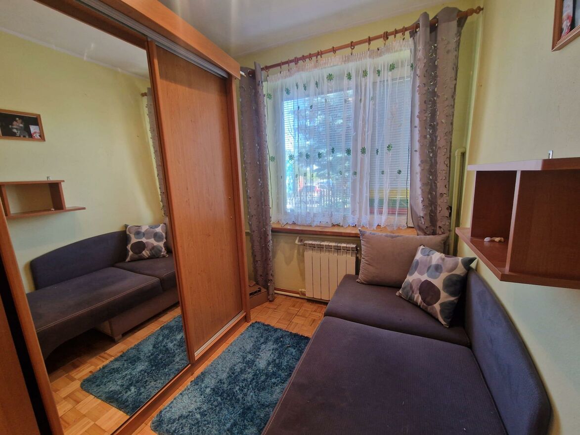 2 pokoje, duża kuchnia, łazienka, WC, korytarz, schowek. Podpiwniczenie i strych z możliwością adaptacji. Okna PCV