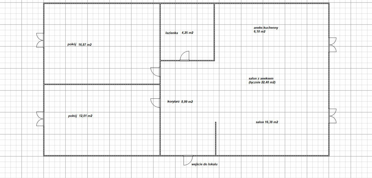 Pomieszczenia - Mieszkanie składa się z: salonu z aneksem kuchennym (22,48 m2), 2 pokoi (16,87 m2, 12,01 m2), łazienki (4,25 m2) i przedpokoju (8,99 m2).