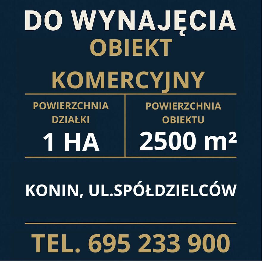 Do wynajęcia obiekt komercyjny o łącznej powierzchni ok. 2 500 m², położony na działce o powierzchni 1 ha, zlokalizowany w Koninie przy ul. Spółdzielców – jednej z głównych arterii miasta, o bardzo dużym natężeniu ruchu samochodowego.Zgodnie z miejscowym planem zagospodarowania przestrzennego teren przeznaczony jest pod TAG – tereny aktywizacji gospodarczej, co umożliwia szeroki zakres działalności.