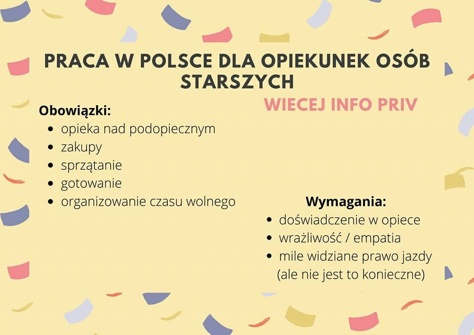 Posiadam zlecenia w Polsce jako Opiekun Osób Starszych.Dojazd, zakwaterowanie oraz wyżywienie jest zapewnione.