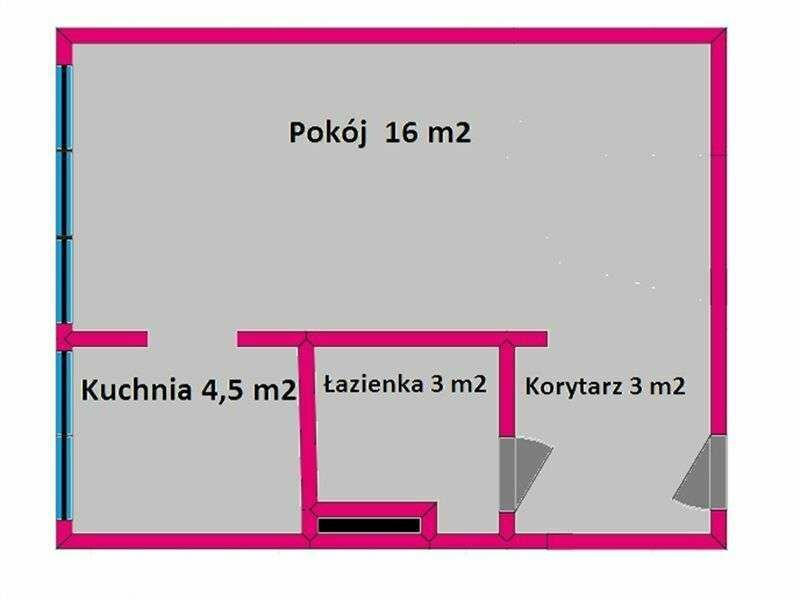 Całe mieszkanie ma 26,54 m2 powierzchni użytkowej, z czego około 16 m2 to pokój, 4,5 m2 przypada na jasną kuchnię. Reszta to łazienka (3m2) oraz przedpokój(3m2) zabudowany szafą i pawlaczem.