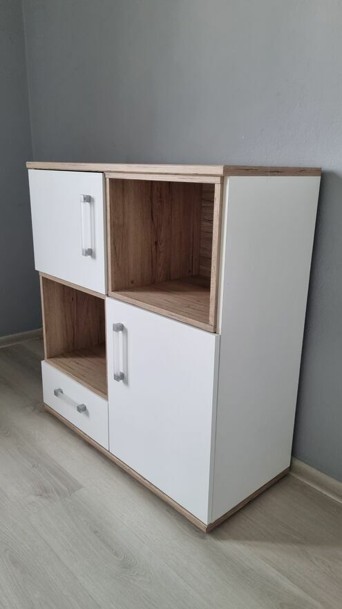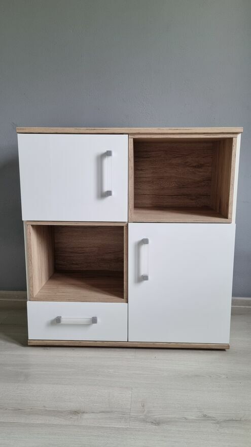 Sprzedam, używaną jednak w bardzo dobrym stanie szafkę w kolorze białym z połyskiem i dodatkami w kolorze skandynawskim, fimy BLACK RED WHITE. Szafka wykonana z solidnych materiałów, bardzo pojemna i praktyczna.Wymiary szafki