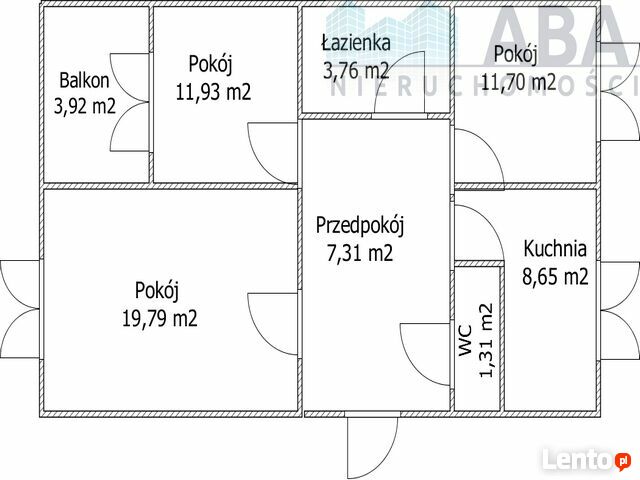Lokal tworzą: przedpokój (7,31 m2), łazienka (3,76 m2), kuchnia (8,65m2), pokój wyjściem na balkon (19,79m2),dwa pokoje( 11,93m2, 11,70m2). oraz wc (1,31m2) Mieszkanie utrzymane w dobrym standardzie.