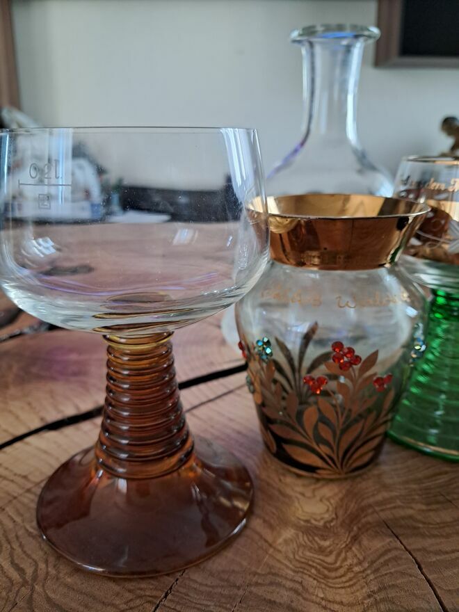 Sprzedam zestaw ozdobnego szkła widoczny na zdjęciu. Są to przedmioty pamiątkowe, prawdopodobnie pochodzenia niemieckiego (napisy na szkle).W skład zestawu wchodzi 7 elementów:
